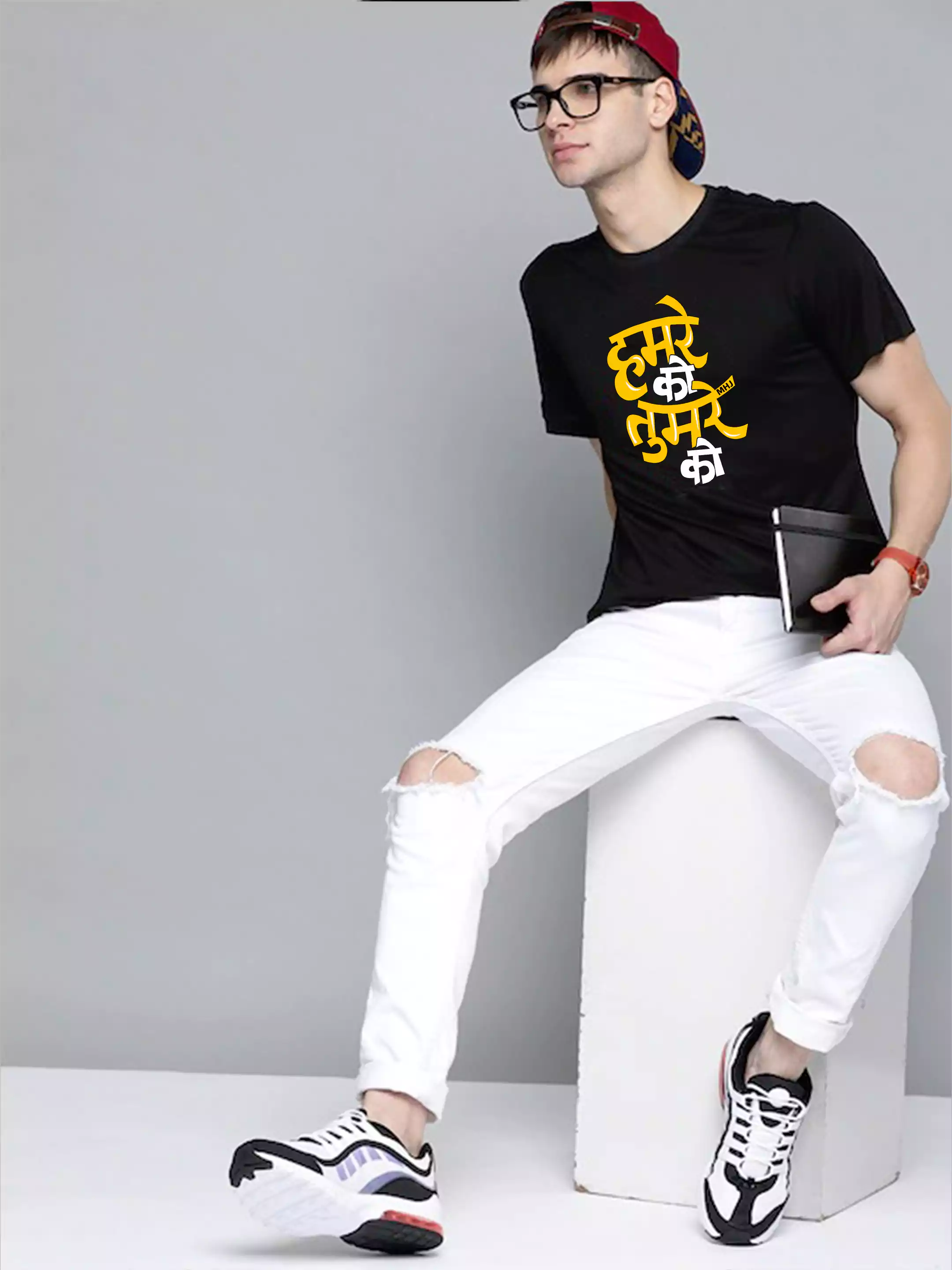 Maharashtrachi Hasya Jatra Official Merchandise. The Model (height 5.10") is wearing  size M-40, Material: 100% Cotton 180 GSM (Bio Washed). Preshrunk to provide a soft texture. Fit: Relaxed Comfort...