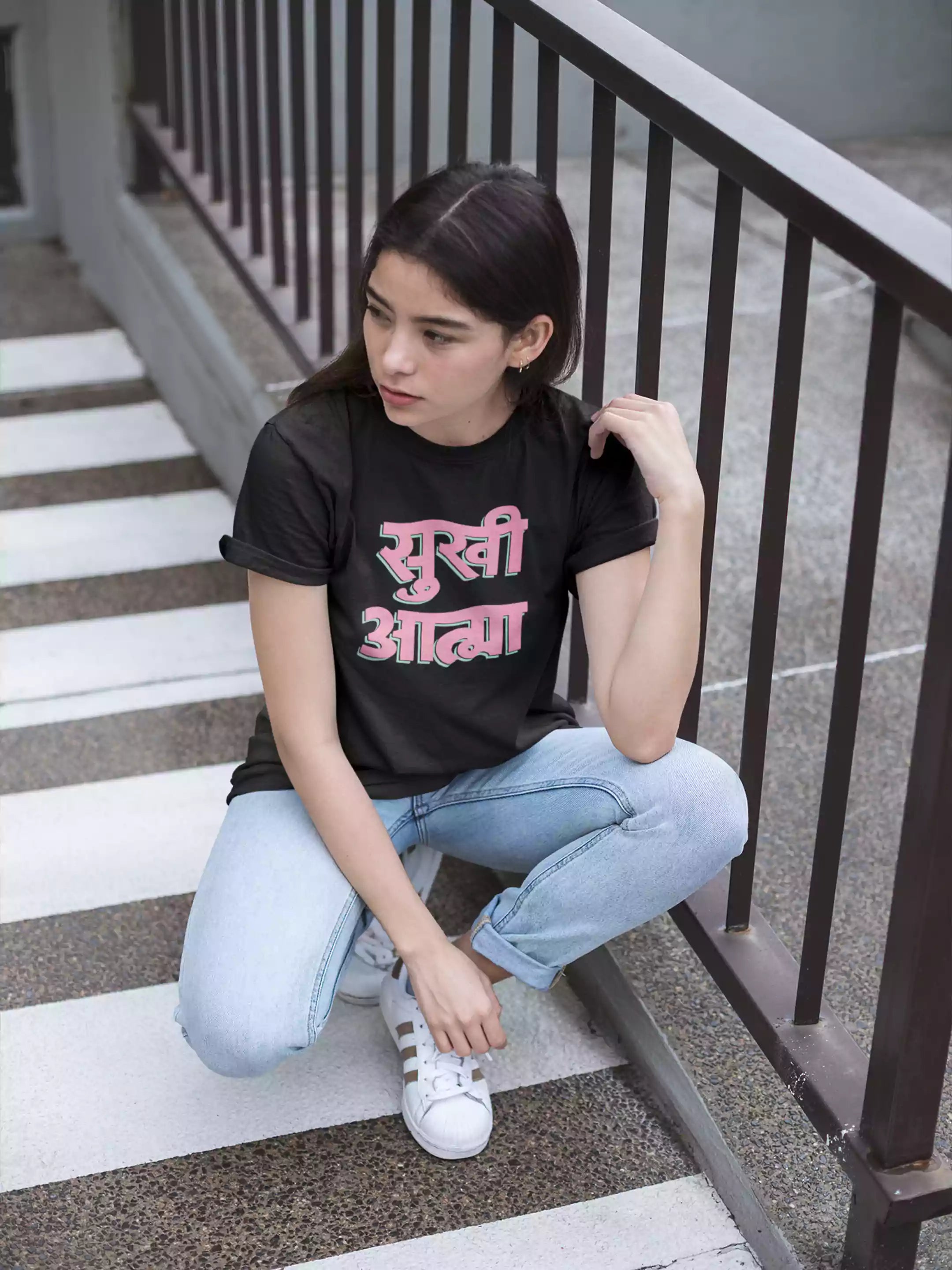 The Female model (height 5.5") is wearing  size S-38, Material: 100% Cotton 180 GSM (Bio Washed). Preshrunk to provide a soft texture. Fit: Relaxed Comfort Fit. Suitable for Daily Wear....