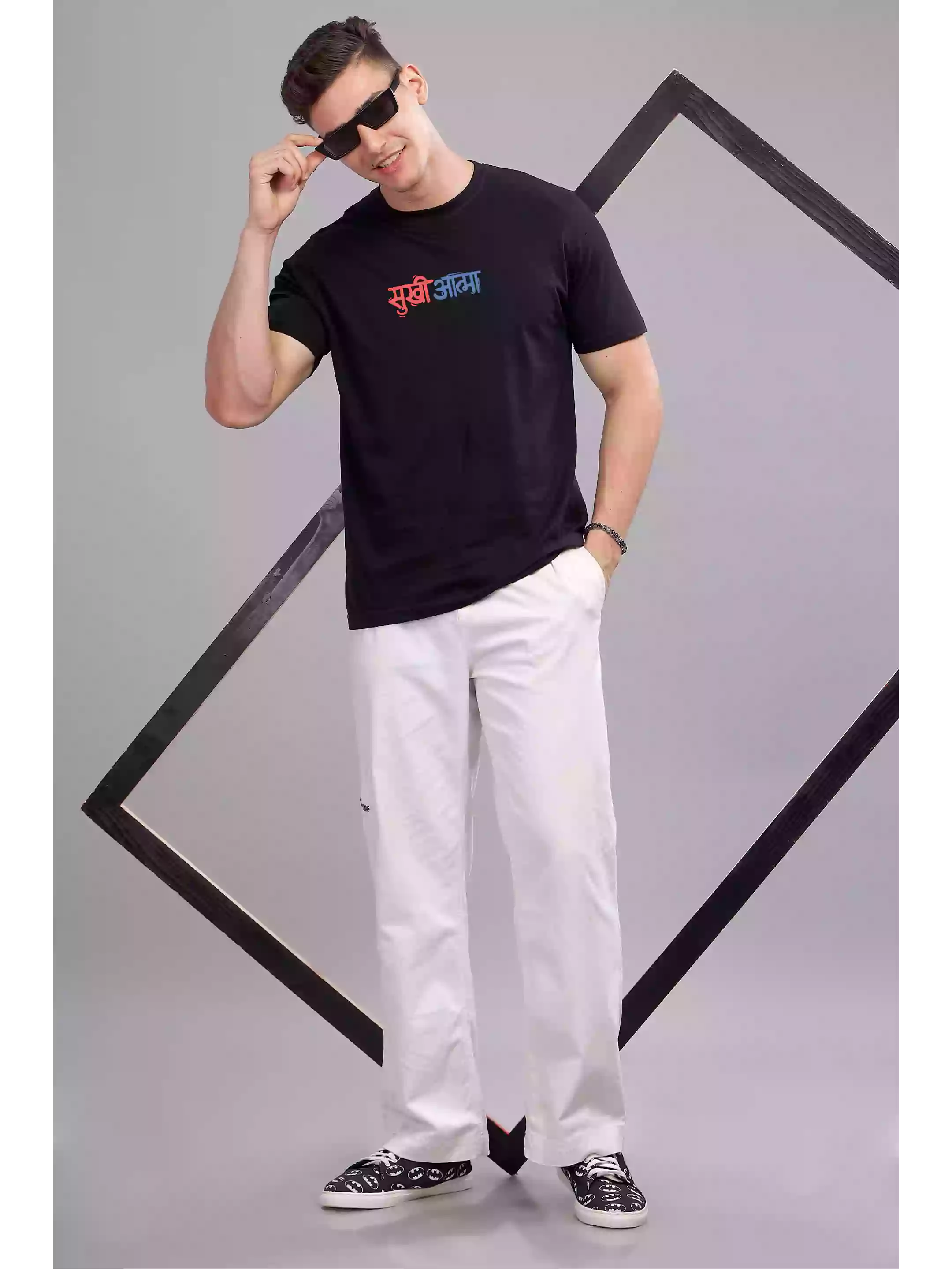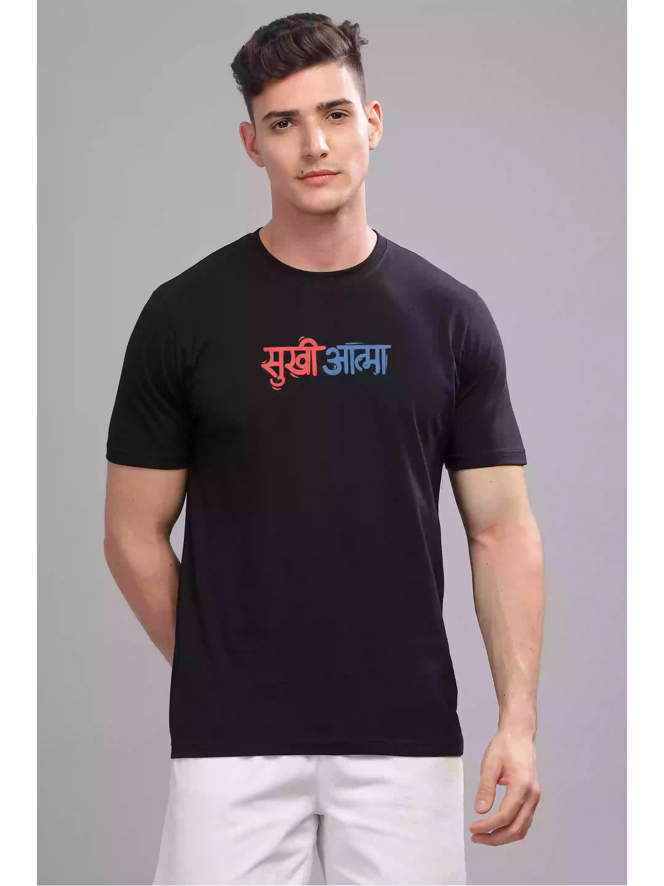 The Male model (height 5.10") is wearing  size M-40, T-shirt Color - Black Material: 100% Cotton 180 GSM (Bio Washed). Preshrunk to provide a soft texture. Fit: Relaxed Comfort Fit....